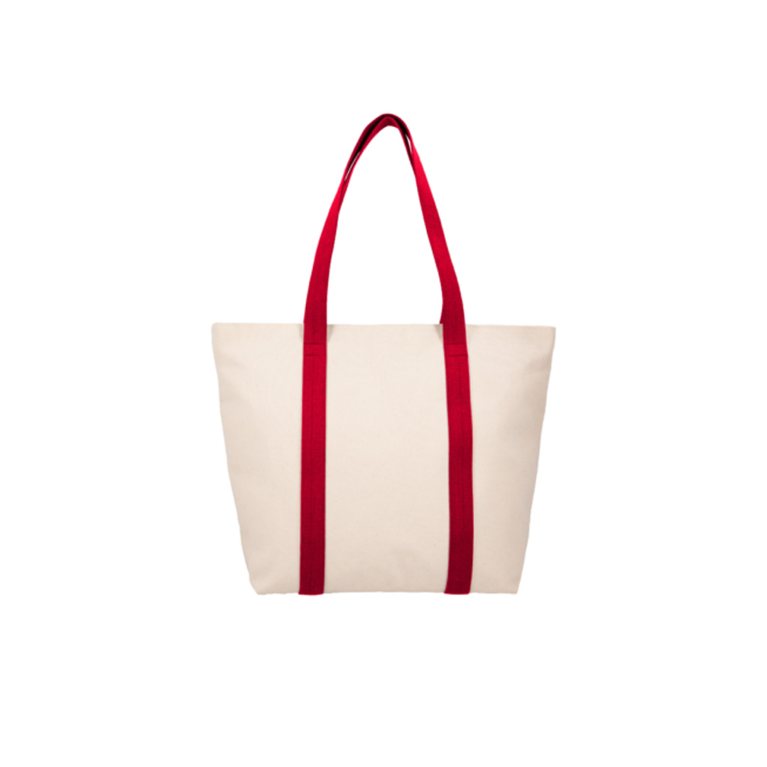 Bolso de lona con forro de Lienzo Crudo. Cierre con broche Imán. Manijas de cinta de diferentes colores tejida. Material de las manijas : algodón de 30 mm Material del bolso : algodón Medidas : 46 x 38 x 13 cm