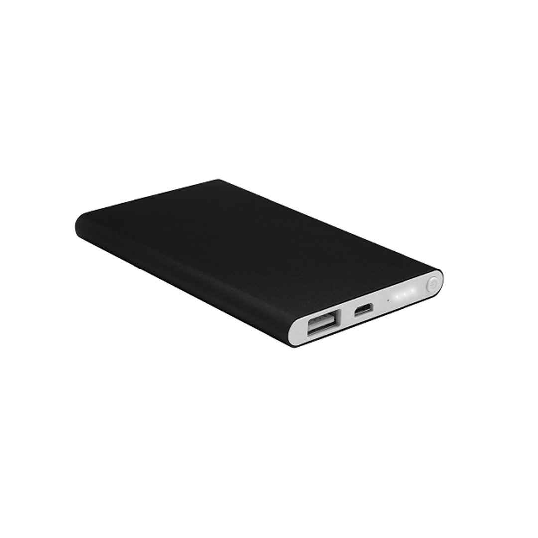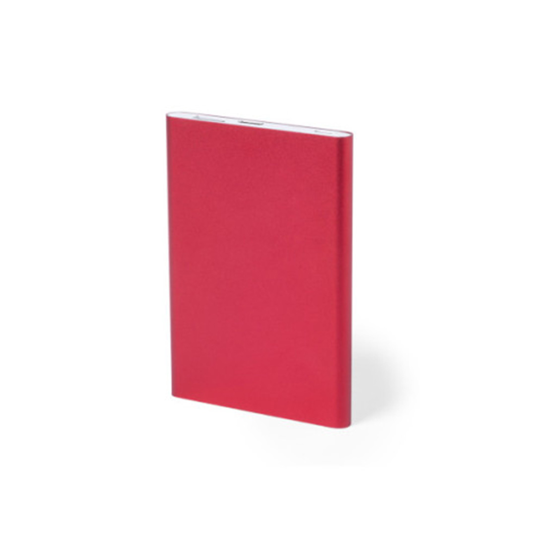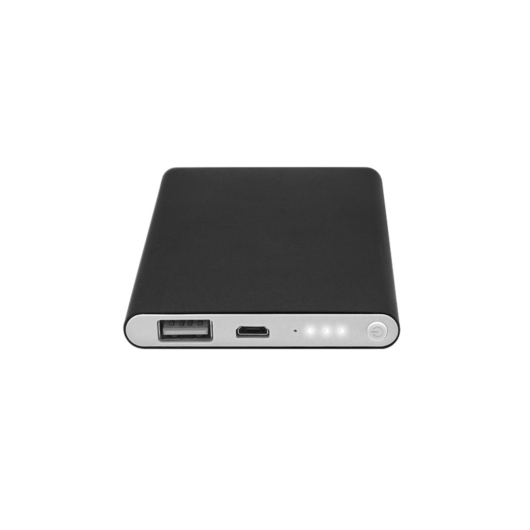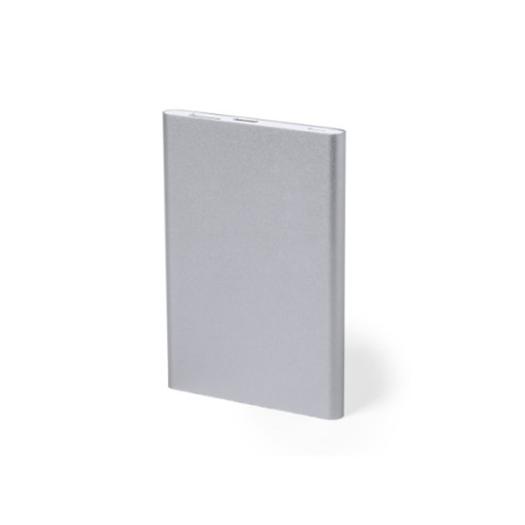 Dos entradas: una USB y otra mini USB. Botón de encendido y luces led indicadora de carga. Medida: 11 x 6,5 x 1 cm. Capacidad 4000 mah. Material: Metálico.
