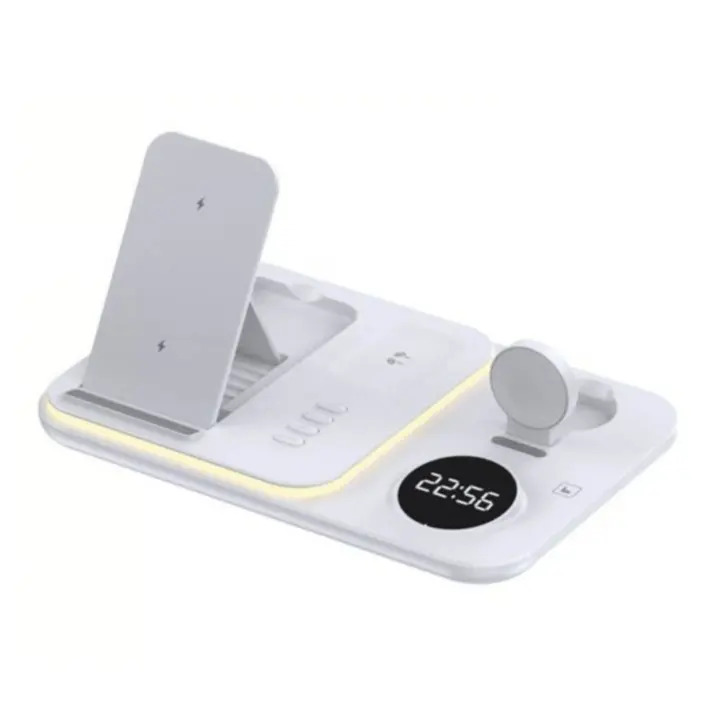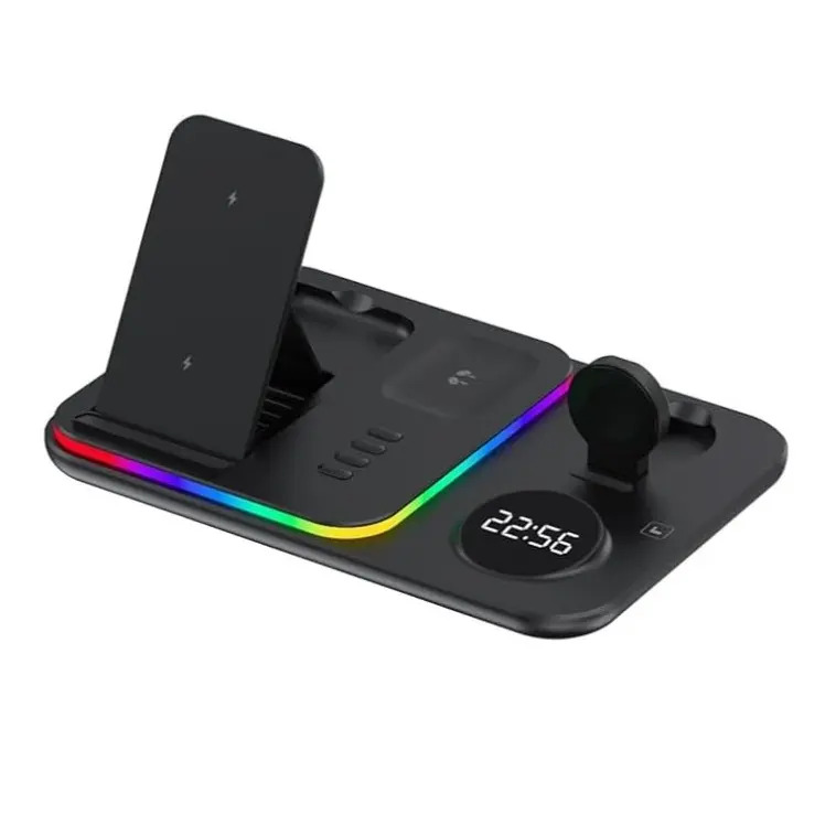 Carga simultáneamente tu celular, auriculares y smartwatch, incluye reloj digital, luz RGB ajustable y puerto USB extra. Cargador inalámbrico 5 en 1 con diseño moderno y compacto.