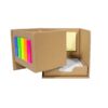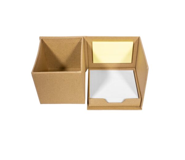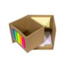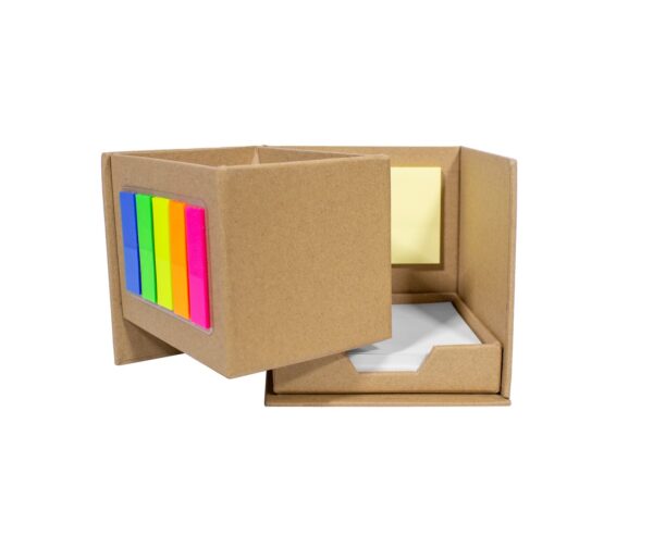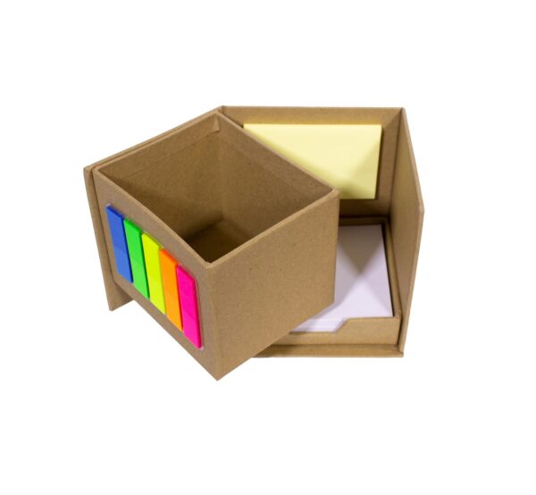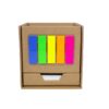 Porta Lápiz con post-it de tiras en diferentes colores flour en el frente. block rectangular con autoadhesivos color amarillo. Y un contenedor con hojas blancas. Material: Carton. Medidas : 10 x 10 x 10 cm.