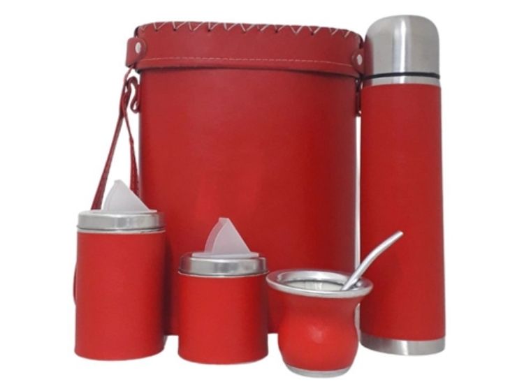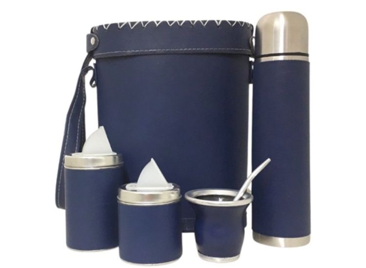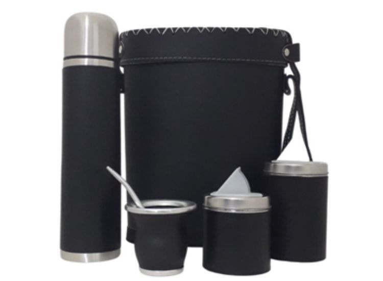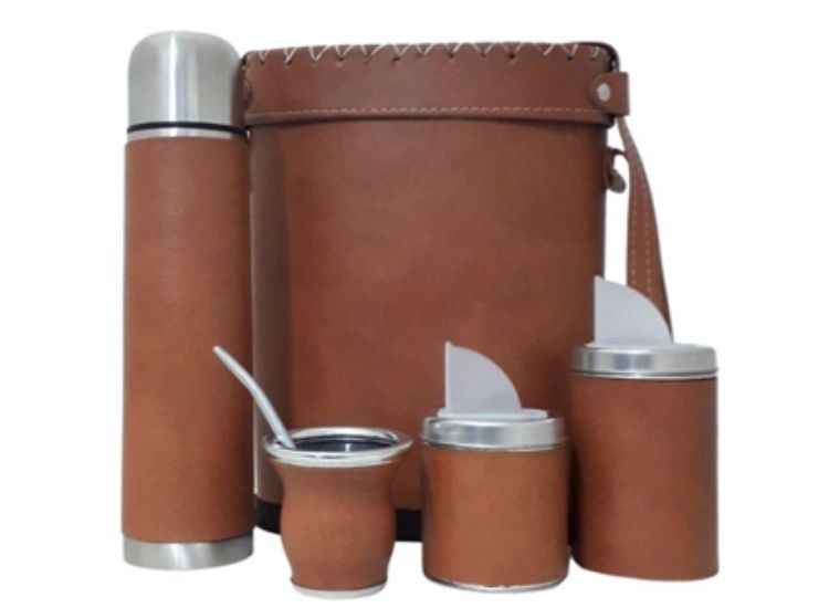 Trabajado en eco cuero. Incluye Portatermo, termo de acero forrado, yerbera, azucarera, mate y bombilla. Portatermo rigido forrado en ecocuero