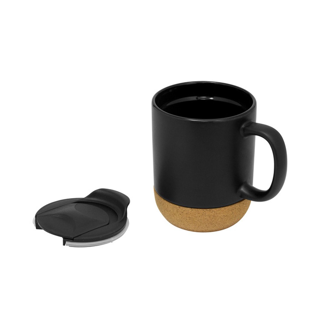 Taza con tapa plástica a presión en color negro y anillo de silicona. Base de corcho y acabado mate en su exterior. Apta para microondas, retirando previamente la base de corcho.